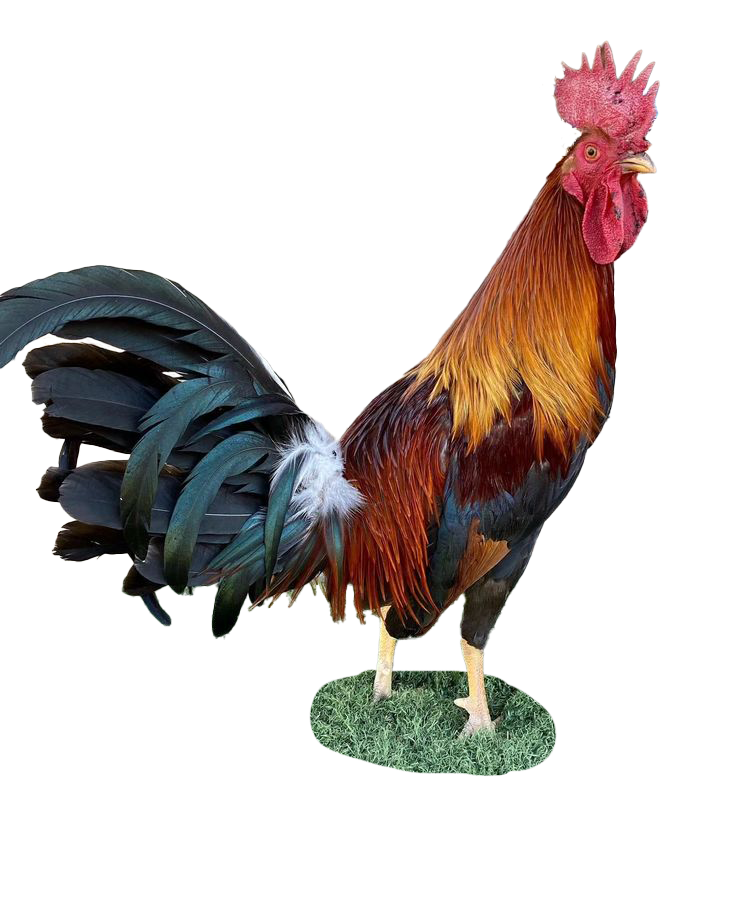 A colorful rooster standing on grass.