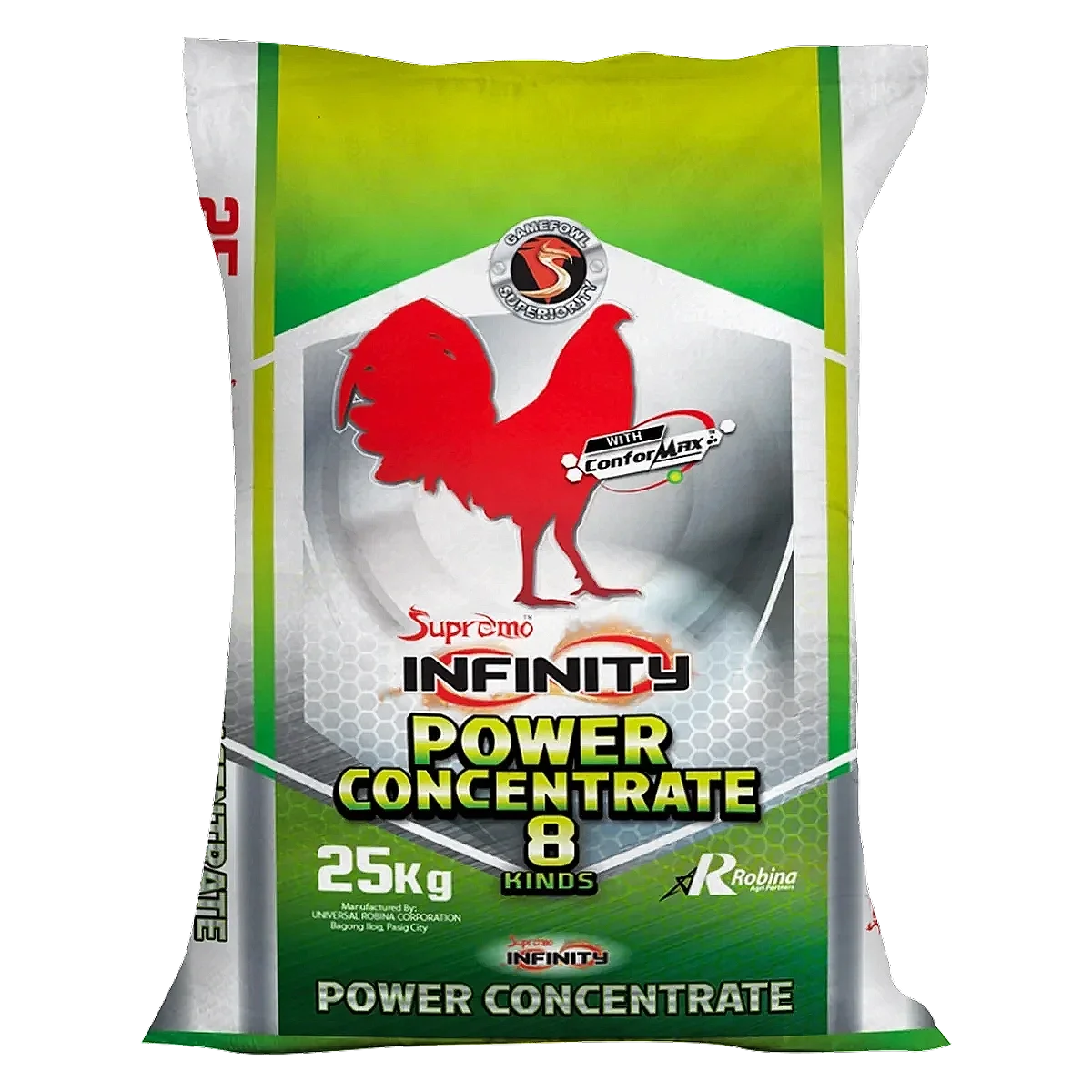 A bag of 25 kilograms of Supreme Infinity Power Concentrate 8, an agricultural fertilizer product featuring a red rooster logo and branding from Universal Robina Corporation.